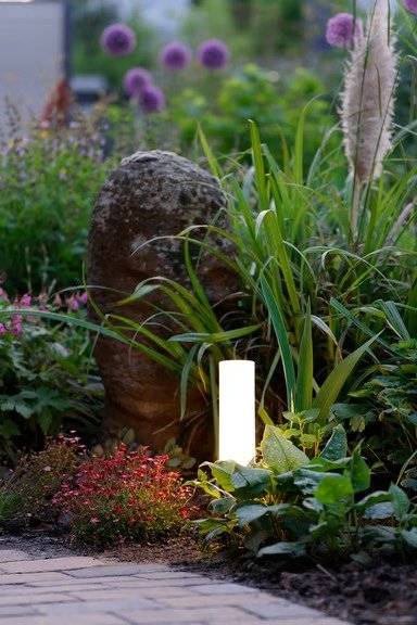 These Beleuchten luminaires are designed for private gardens, creating a pleasant light effect along paths, terraces, and flower beds. The high-quality three-ply opal glass sphere serves as an elegant, unshielded light distributor, providing balanced and inviting illumination.